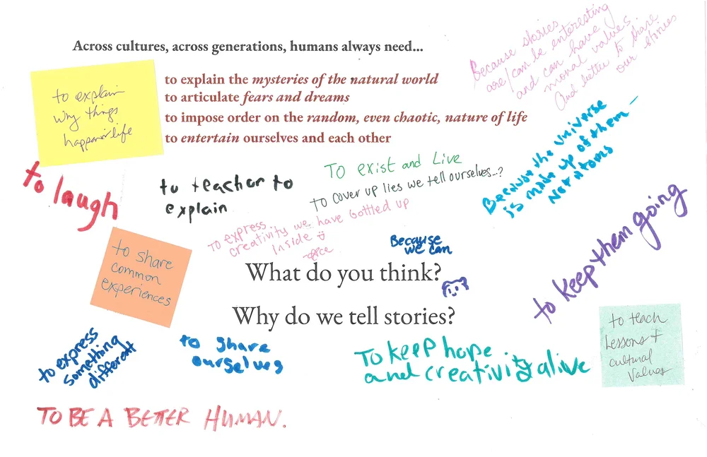 As a teacher of English Language Arts at 星空无限传媒, I started the school year with a 鈥渃ommunity question鈥 area near my desk. The tabletop poses questions and invites student and staff responses. The first question, back in September, had to do with storytelling.